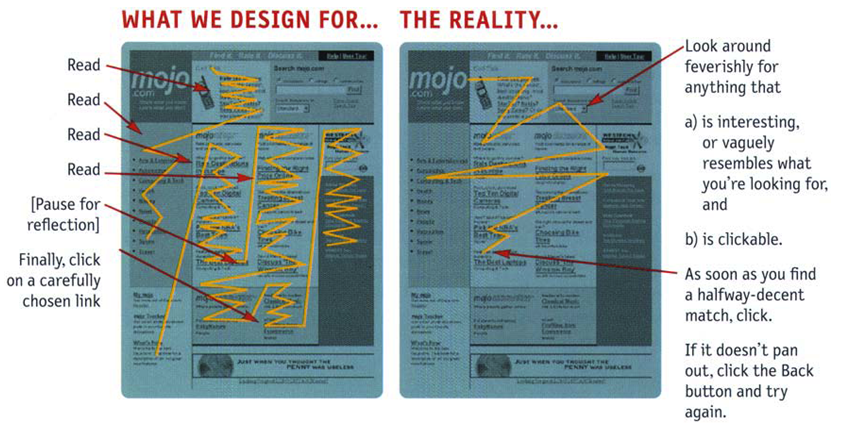 左側是設計師期望用戶的瀏覽方式,右側為用戶實際的瀏覽方式—摘自《Don’t make me think》