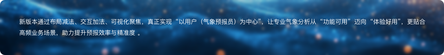 打造氣象預報全流程智能分析中樞,覆蓋數據可視化、多模式對比、預報調整與決策支持。整合氣象大數據,實現從基礎網格預報展示,到國家級 / 省級指導預報協同,再到模式對比、國省對比的全鏈路業務支撐,成為氣象工作者日常分析、決策的核心工具 。